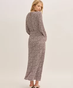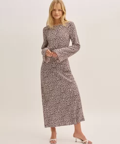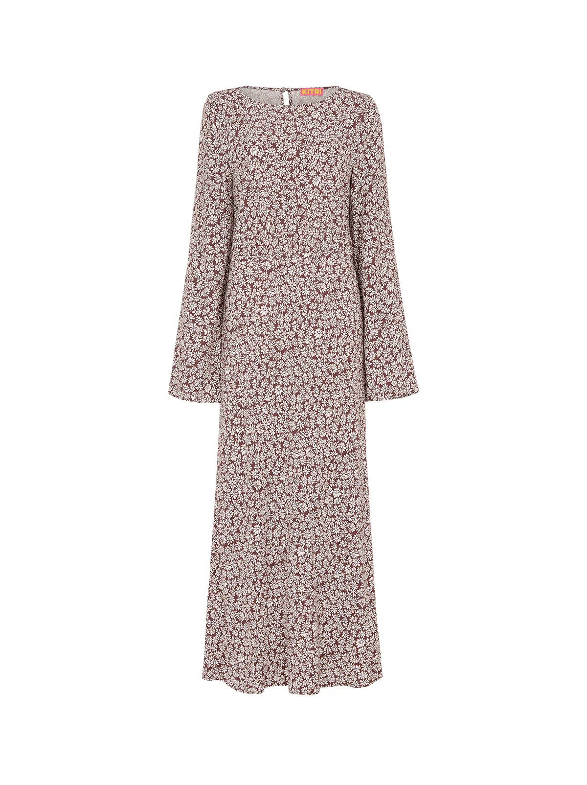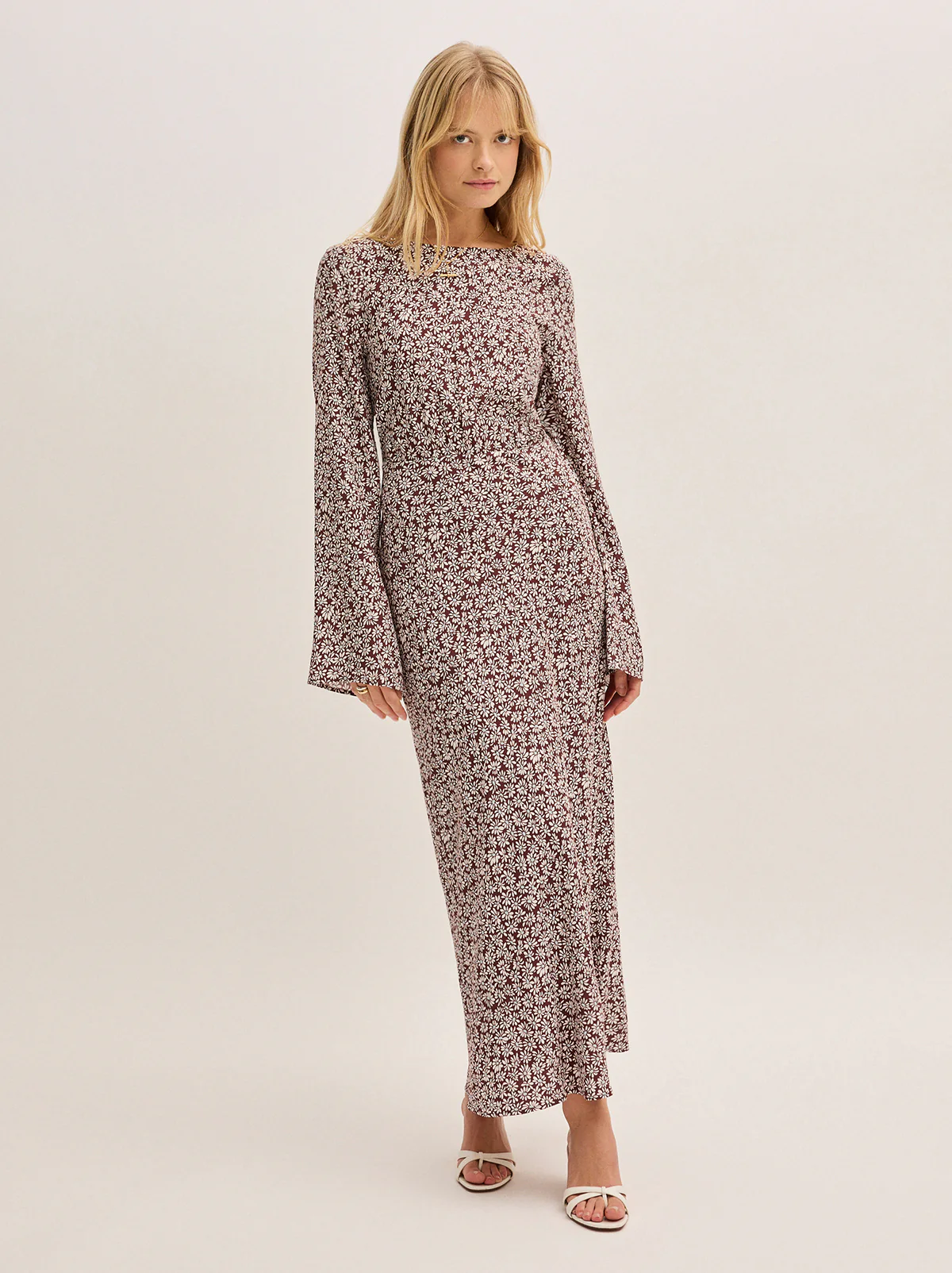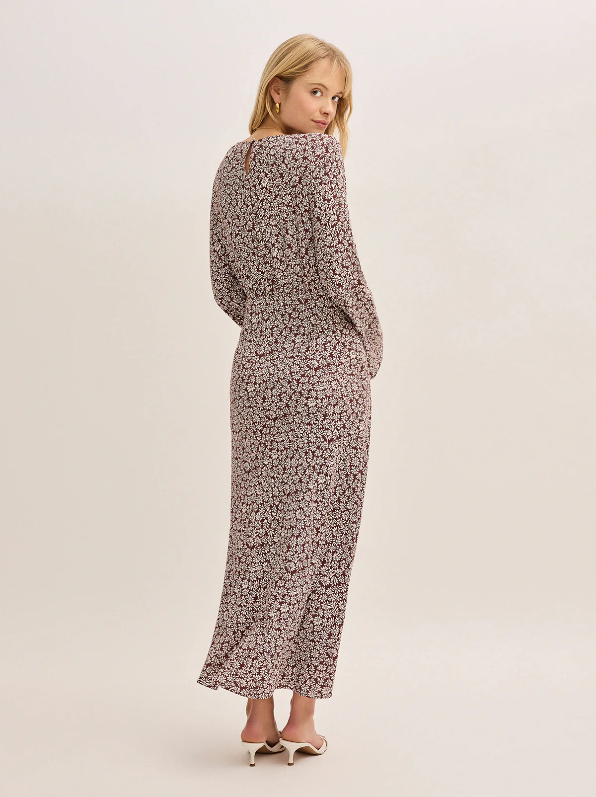 She’s demure. The Adaline Aubergine Daisy Print Dress is an elegant maxi dress featuring a slashed neckline and flared sleeves for a refined yet effortless look. The gently gathered waist seam flows into a flattering, body-skimming bias cut skirt, ensuring a graceful silhouette. Designed in a delicate daisy print on a rich aubergine base, this versatile dress will be your go-to all year long. Pair with boots for a daytime ensemble or elevate with heels for an elegant evening look.