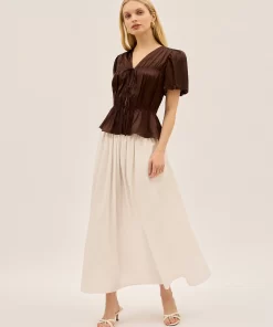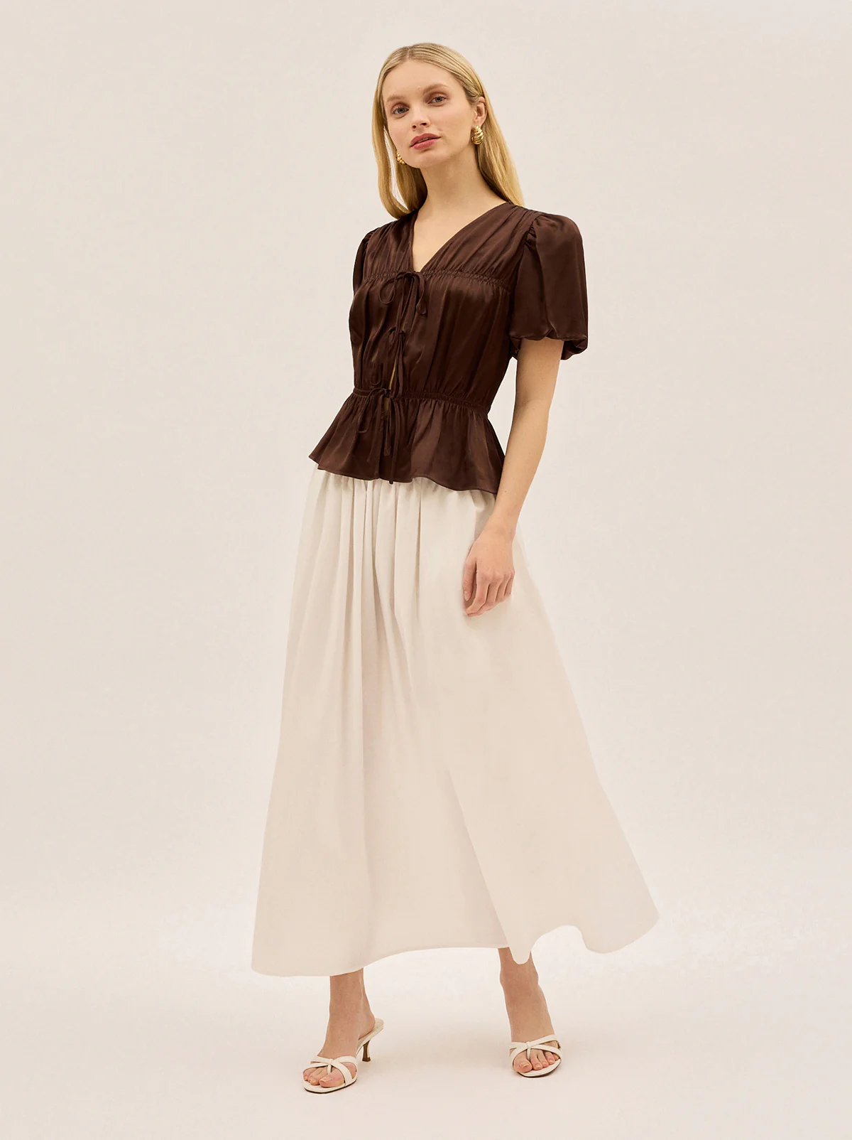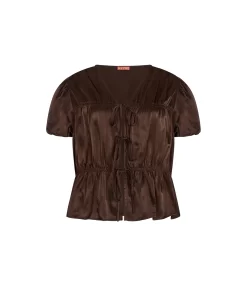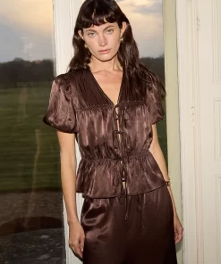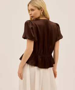 Romantic, reimagined. The Emma Top is crafted from fluid chocolate satin in a bestselling silhouette, featuring a gathered bodice, soft peplum hem and tie-front detailing for a customisable fit. The puffed short sleeves add volume and charm, while the deep brown hue brings instant polish to any outfit.