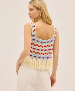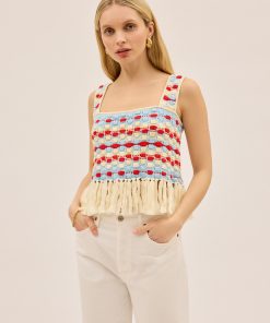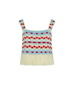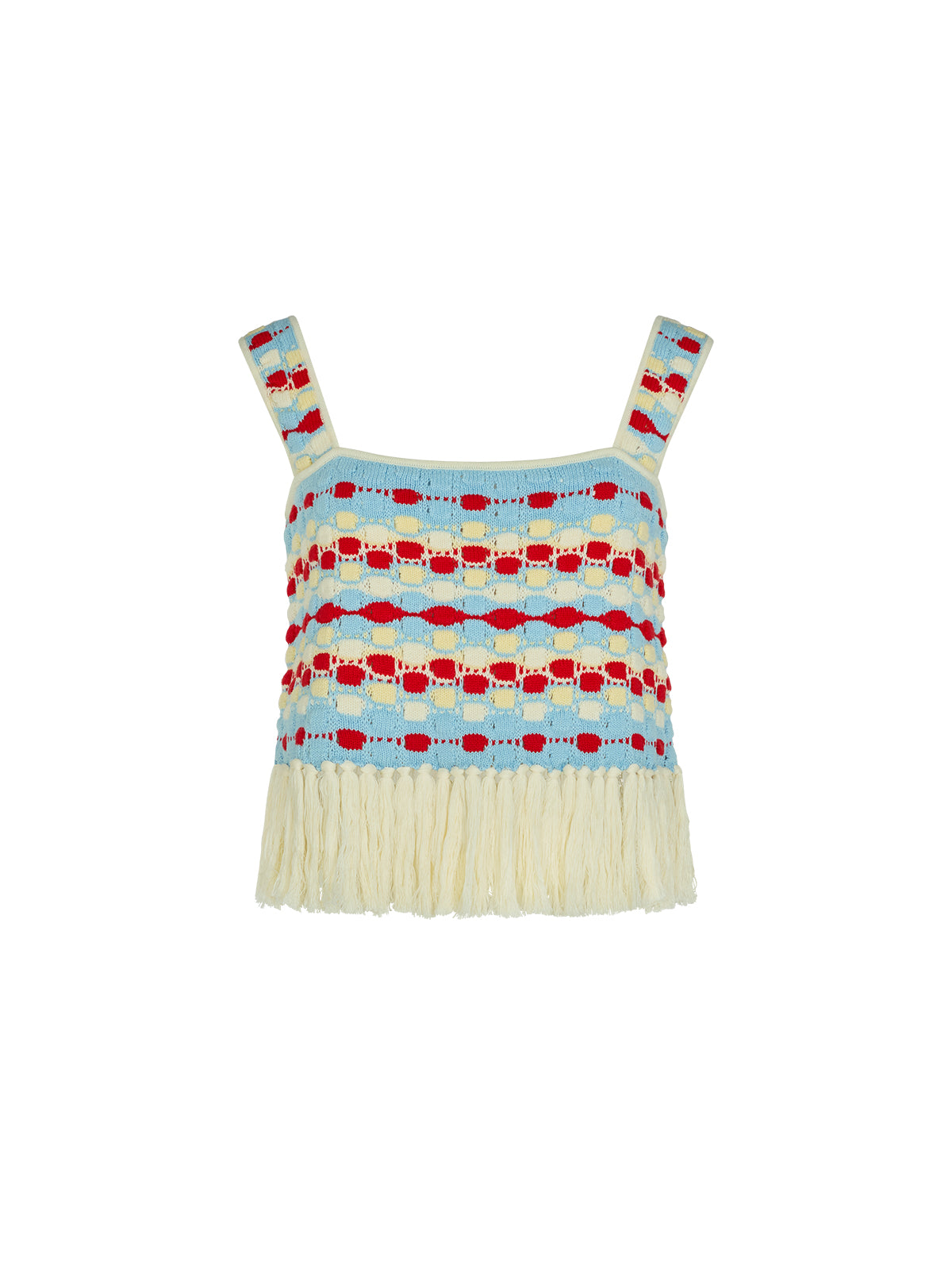 The Roxana top is made from a playful, textured knit in a summer-ready colour palette. With wide straps, a flattering straight neckline and a swingy fringe hem, it’s a statement piece that still feels easy. Wear it with your favourite denim or pair with the matching Margaux dress and Terri cardigan for the full look.