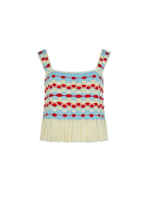 The Roxana top is made from a playful, textured knit in a summer-ready colour palette. With wide straps, a flattering straight neckline and a swingy fringe hem, it’s a statement piece that still feels easy. Wear it with your favourite denim or pair with the matching Margaux dress and Terri cardigan for the full look.