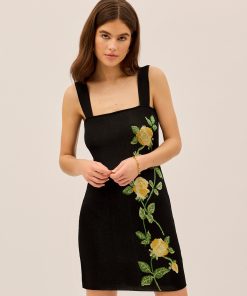 For days (and nights) when you want to keep it simple, but make it a statement. The Corrine Mini Dress is a sleek, figure-hugging knit designed with a square neckline and wide straps for a modern, structured feel. The yellow rose jacquard motif adds a striking contrast against the deep black knit, giving it a touch of romance with a bold edge.