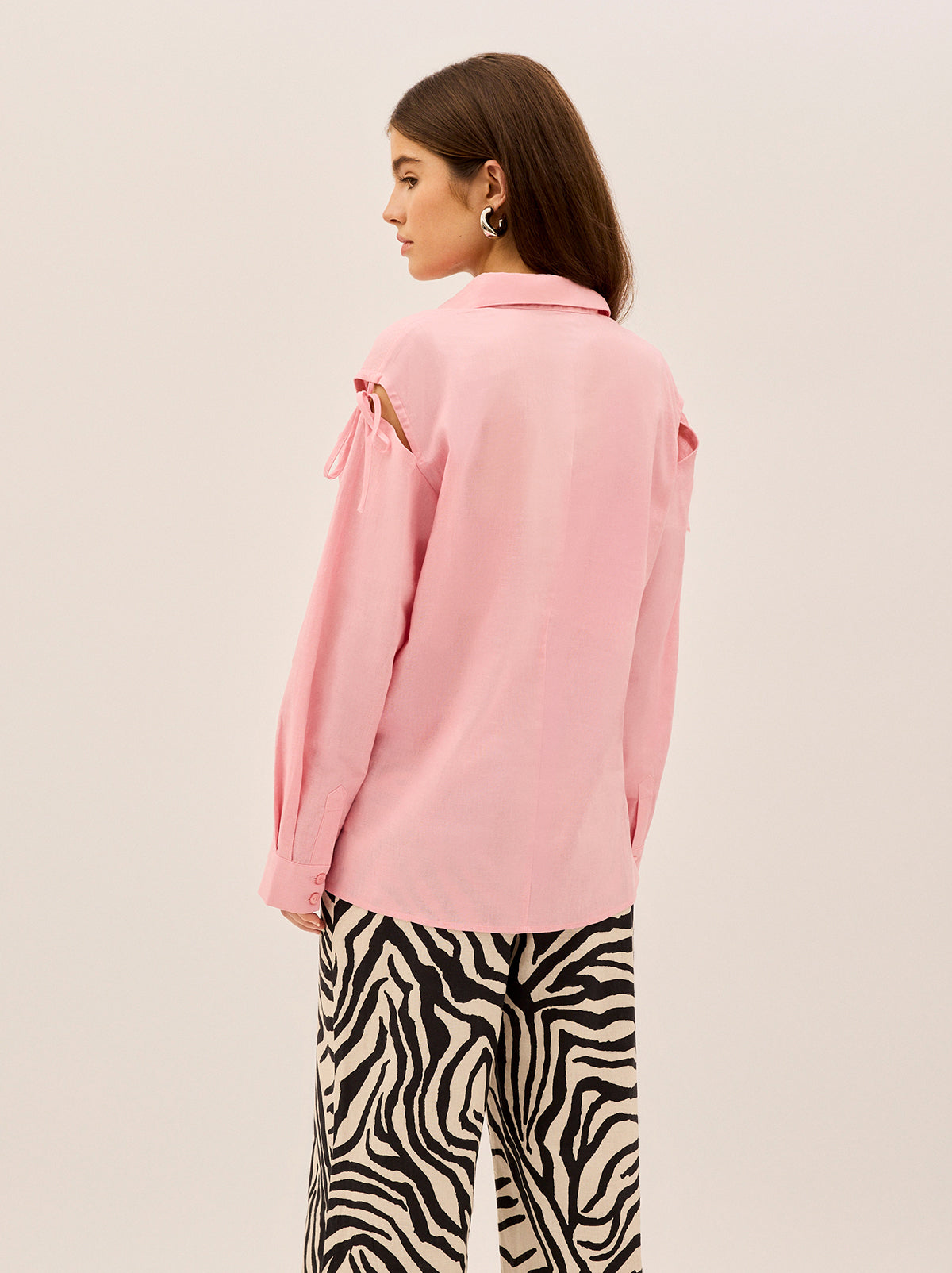 Not your average button-up. The Alix Shirt takes a playful twist on a classic silhouette with its tie shoulder details, creating a modern, deconstructed look. The boxy cut and cotton-linen blend make it an easy, breathable staple, while the mother-of-pearl shell buttons add a touch of polish.