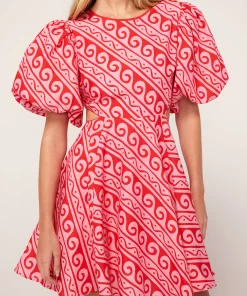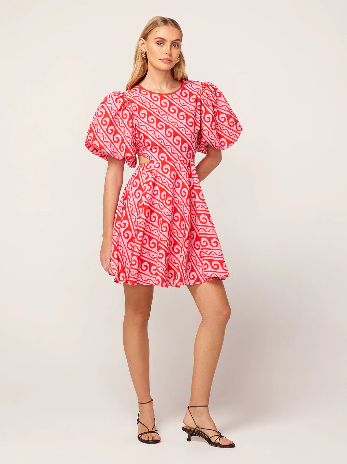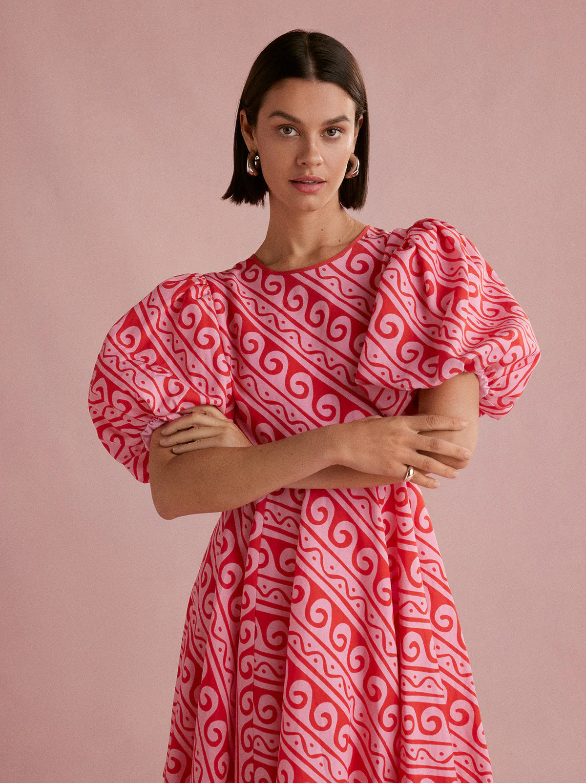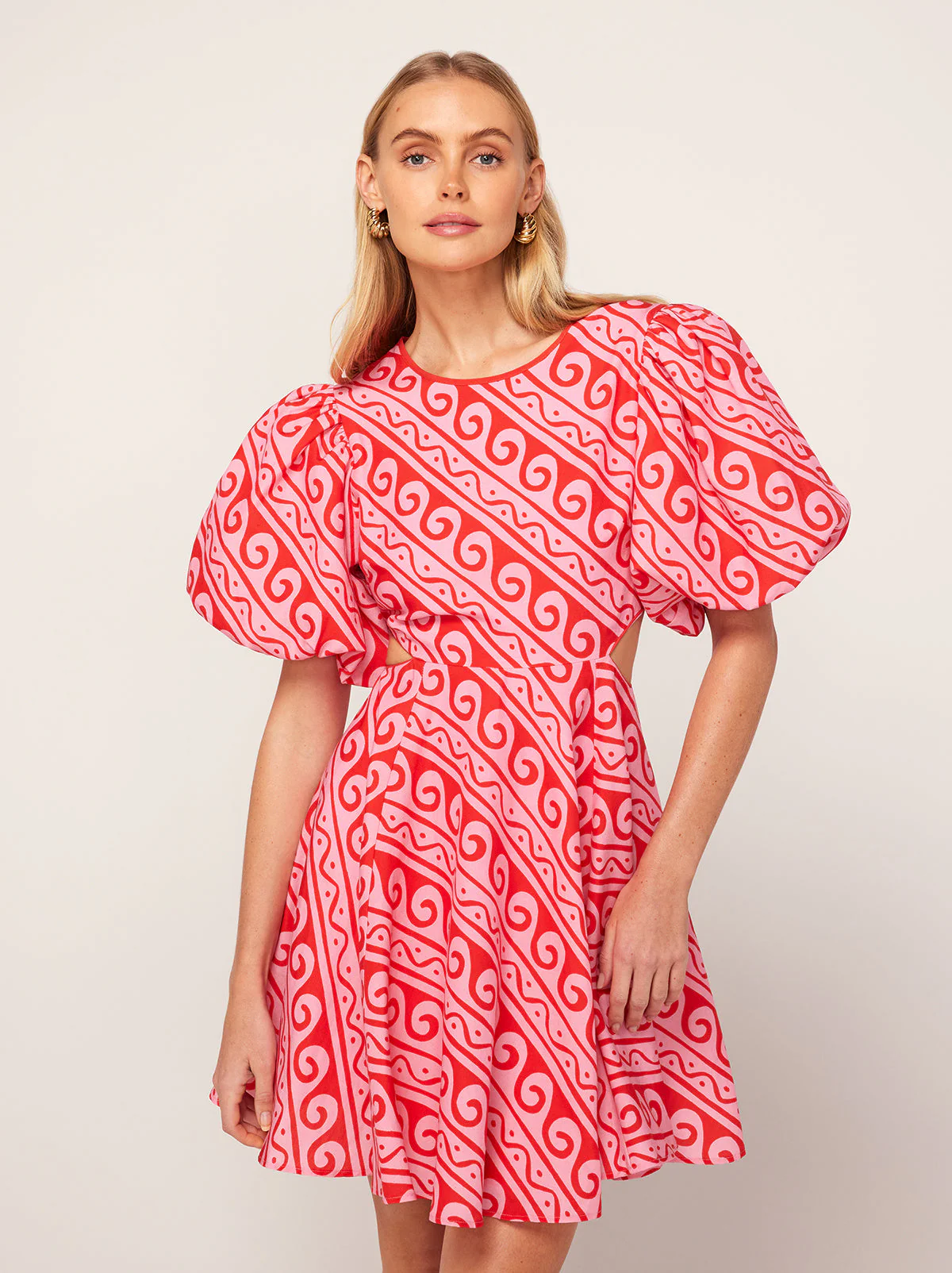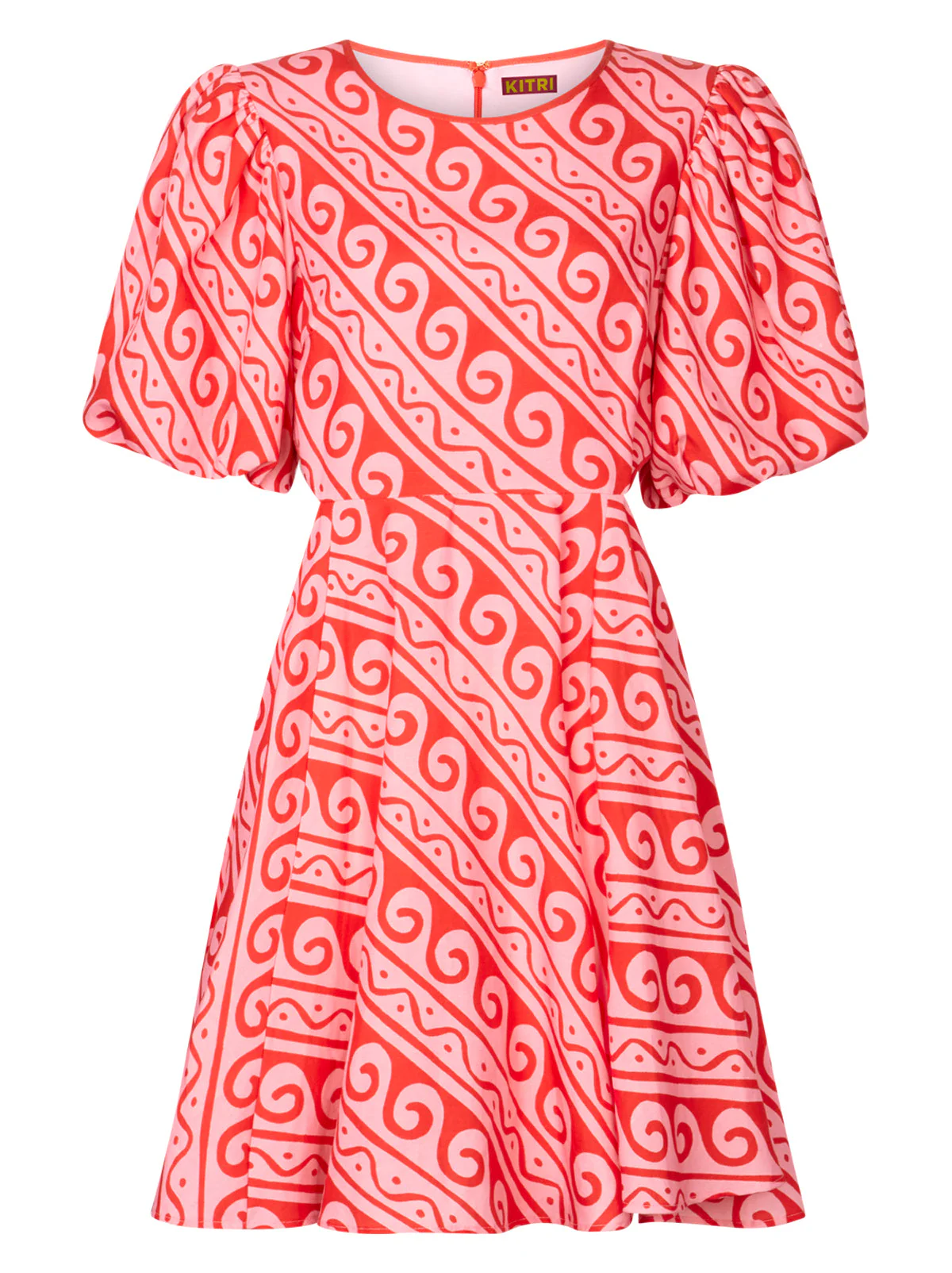 Make mine a mini. Coco’s round neck and flirtatious cutouts are tempered by voluminous flared sleeves and half-circle full skirt (perfect for swishing). Her Pink Wave print is inspired by the art of ancient Greek ceramics in a #KITRIgirls favourite colour combination.