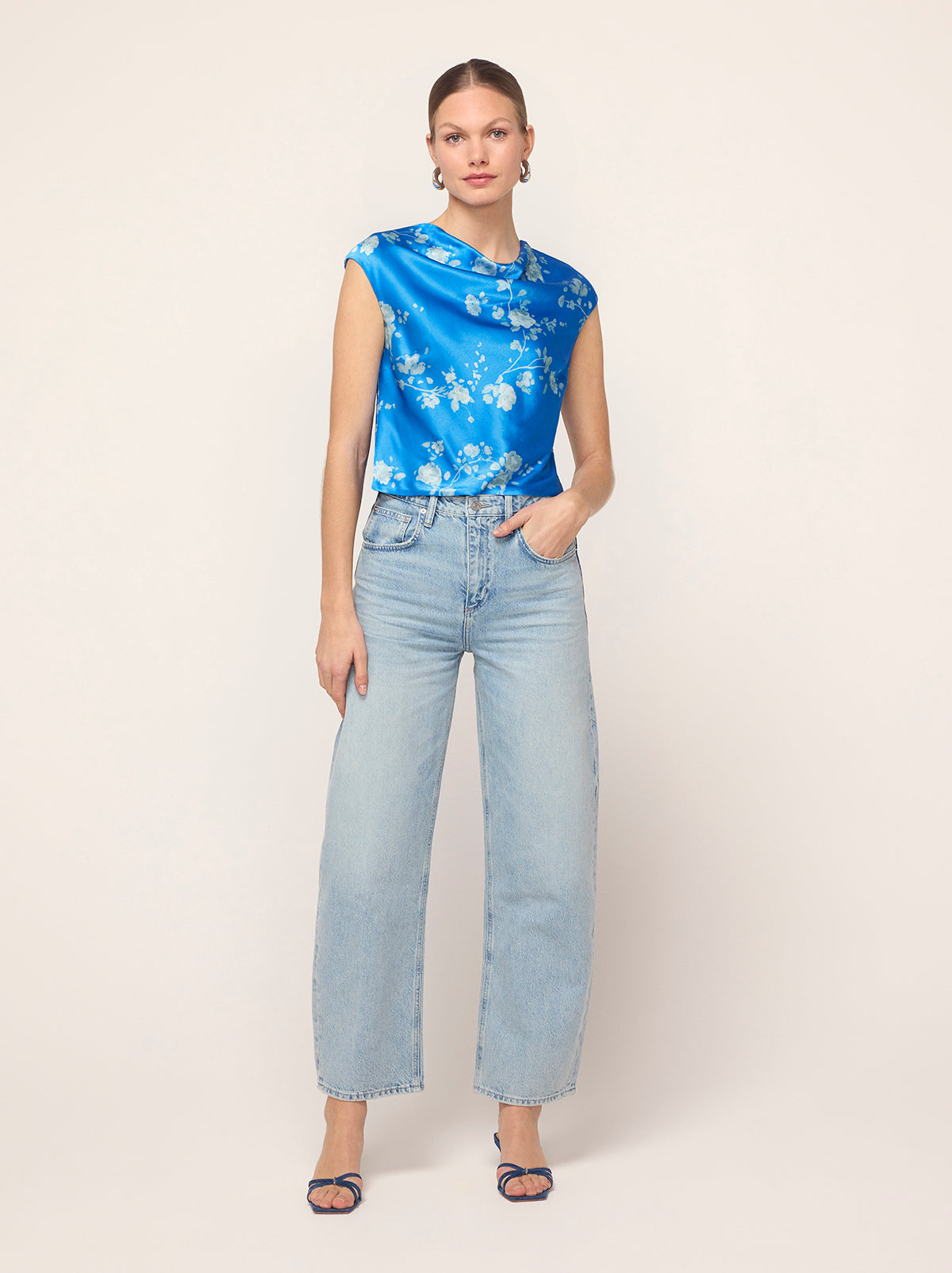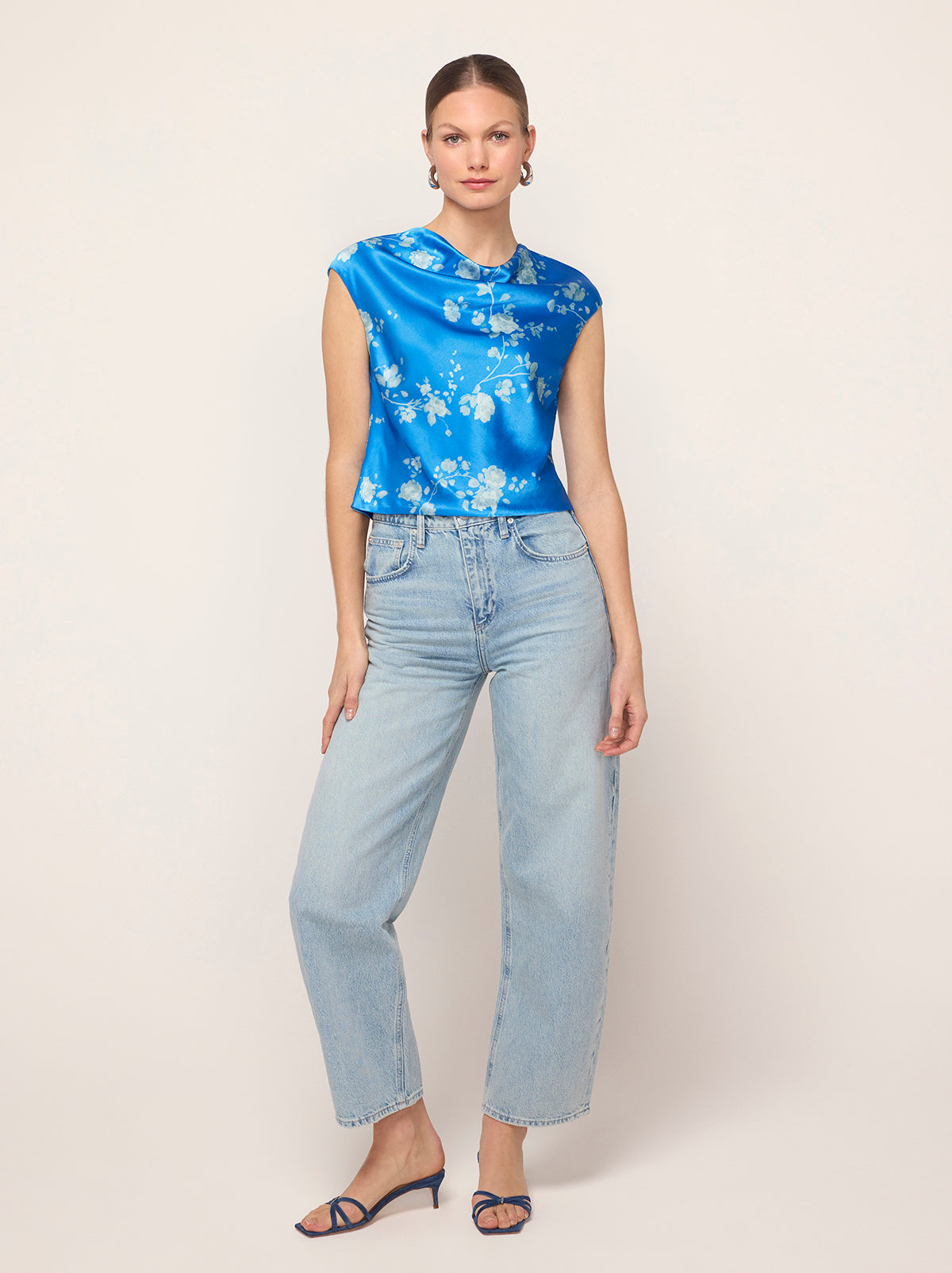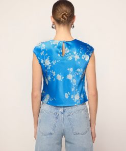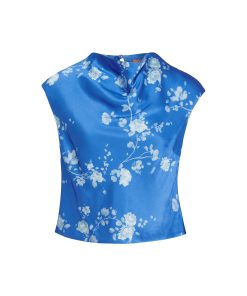 True blue. Monika’s flattering and feminine high cowl neck provides an easy ’90s-inspired feel and her grown-on cap sleeve adds a little touch of coverage. Her elegant Trailing Floral print in soft, tonal blue reflects off the satin, making quite the impression.