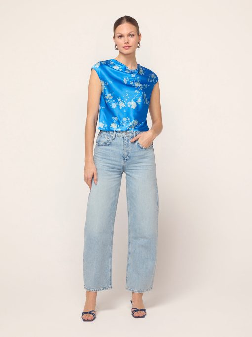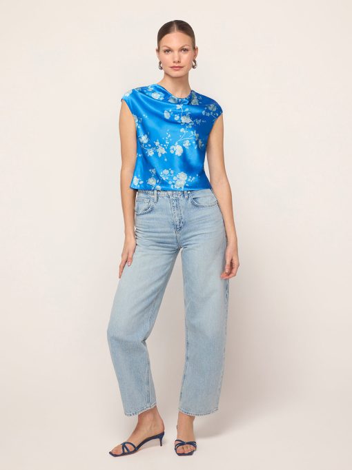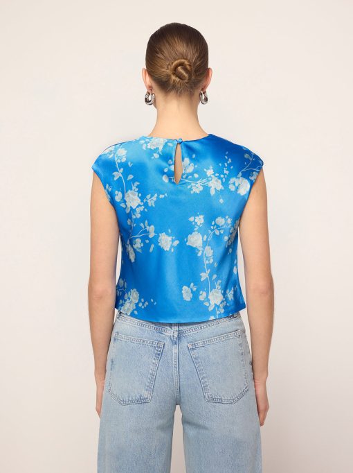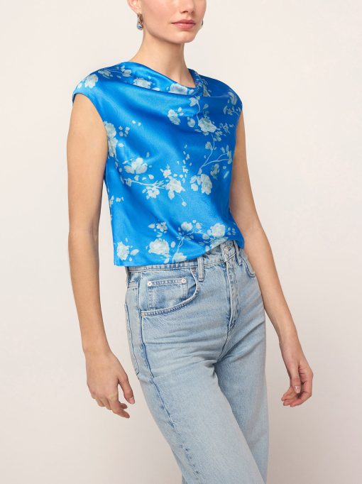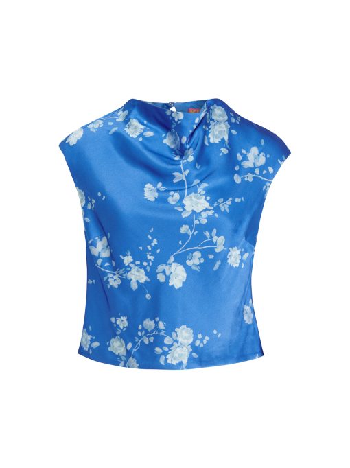 True blue. Monika’s flattering and feminine high cowl neck provides an easy ’90s-inspired feel and her grown-on cap sleeve adds a little touch of coverage. Her elegant Trailing Floral print in soft, tonal blue reflects off the satin, making quite the impression.