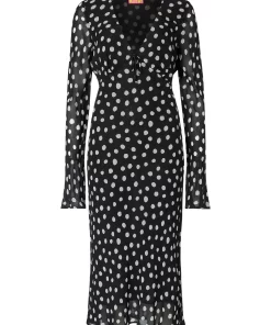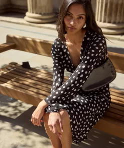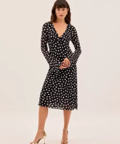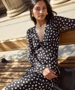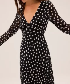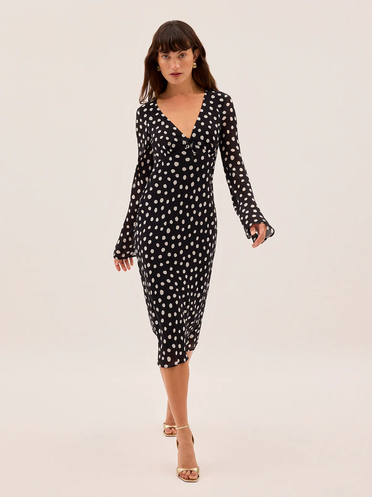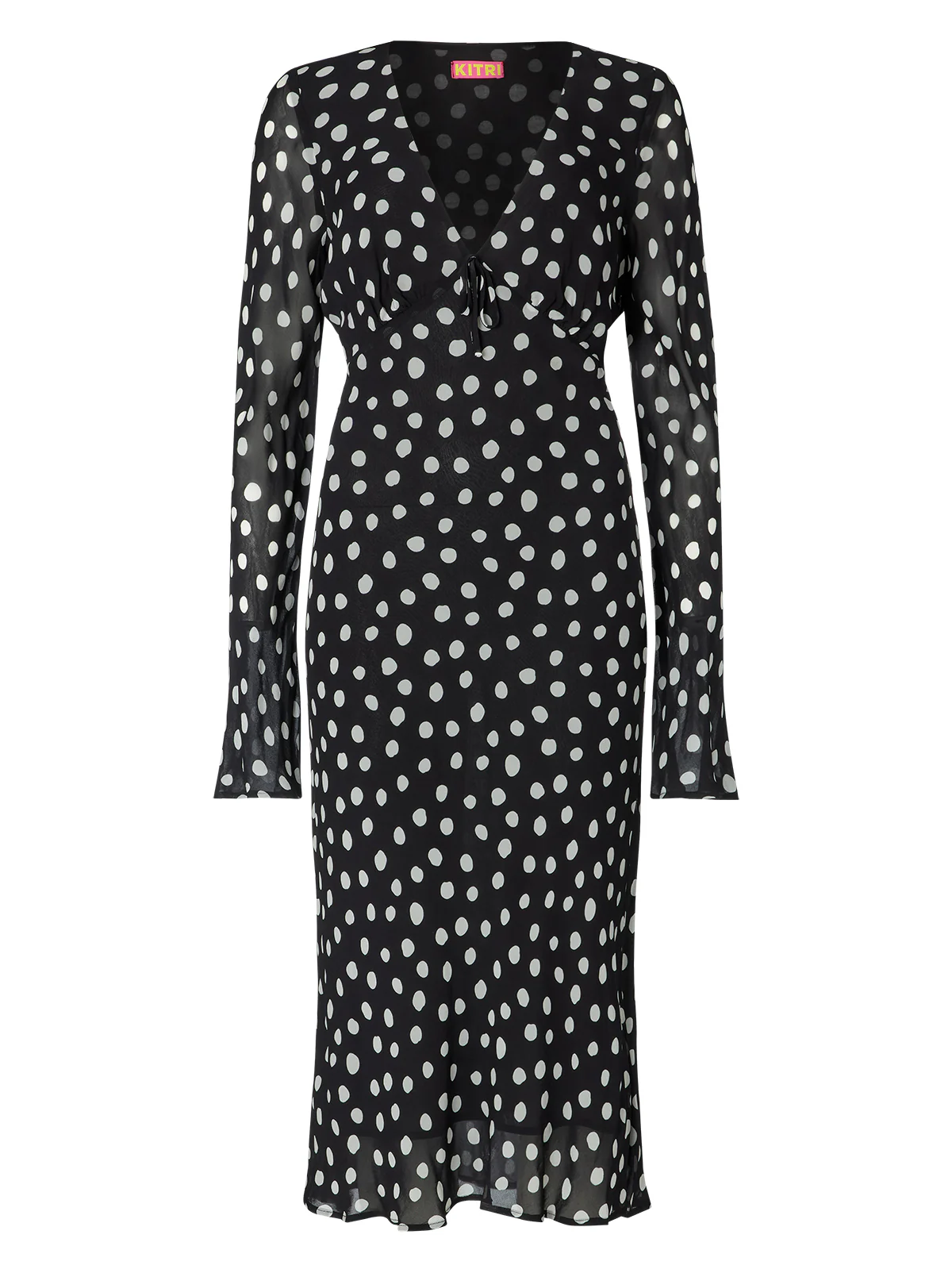 A fresh new silhouette for every RSVP. The Carrie Polka Dot Dress features a flattering deep V-neckline with a soft bow tie detail, flared long sleeves, and a calf-length skirt. Designed in classic and timeless polka dot print, it brings easy elegance to your occasion wear wardrobe.