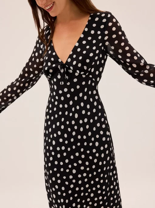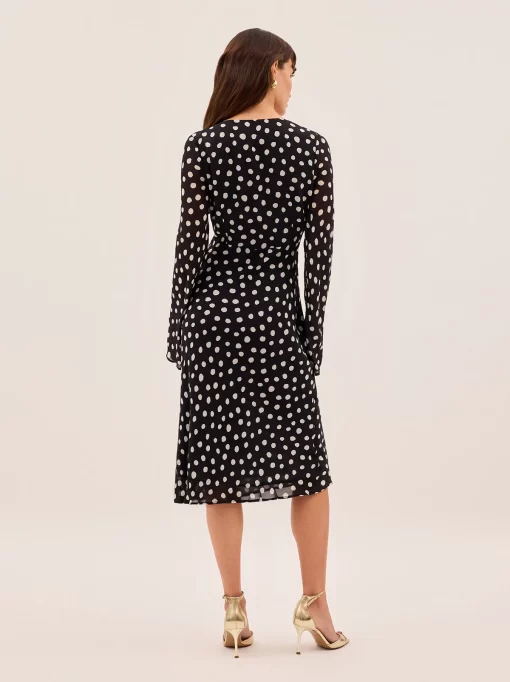 A fresh new silhouette for every RSVP. The Carrie Polka Dot Dress features a flattering deep V-neckline with a soft bow tie detail, flared long sleeves, and a calf-length skirt. Designed in classic and timeless polka dot print, it brings easy elegance to your occasion wear wardrobe.