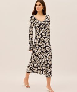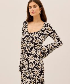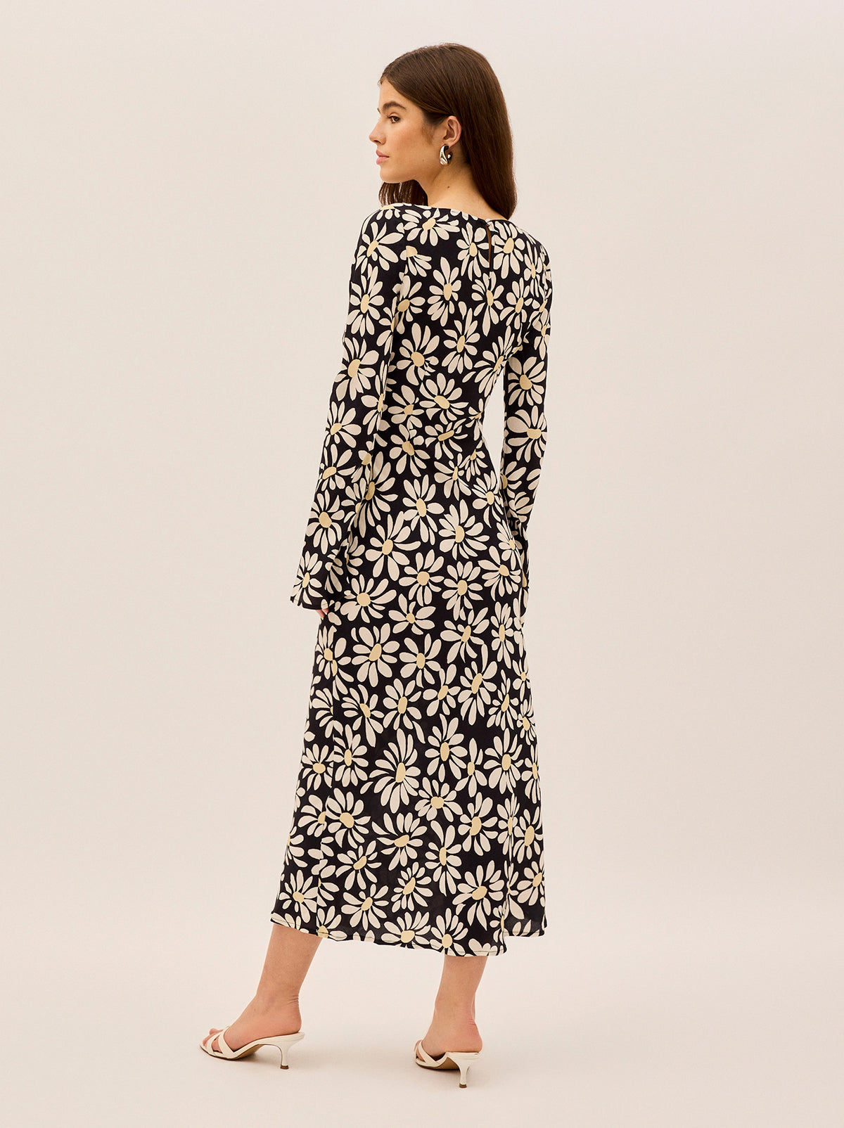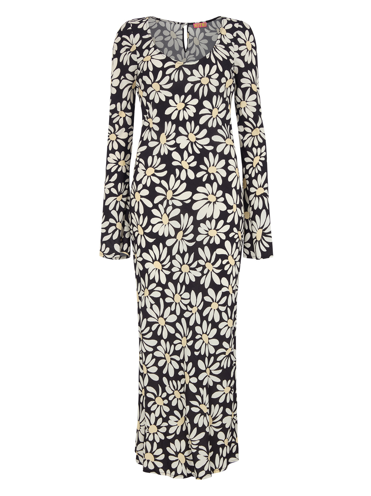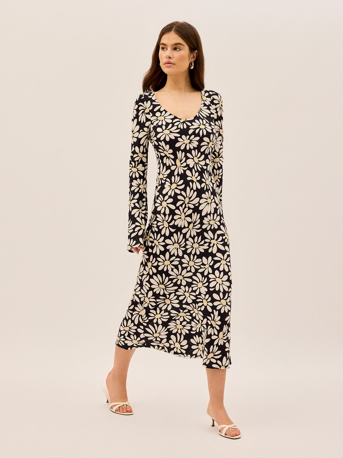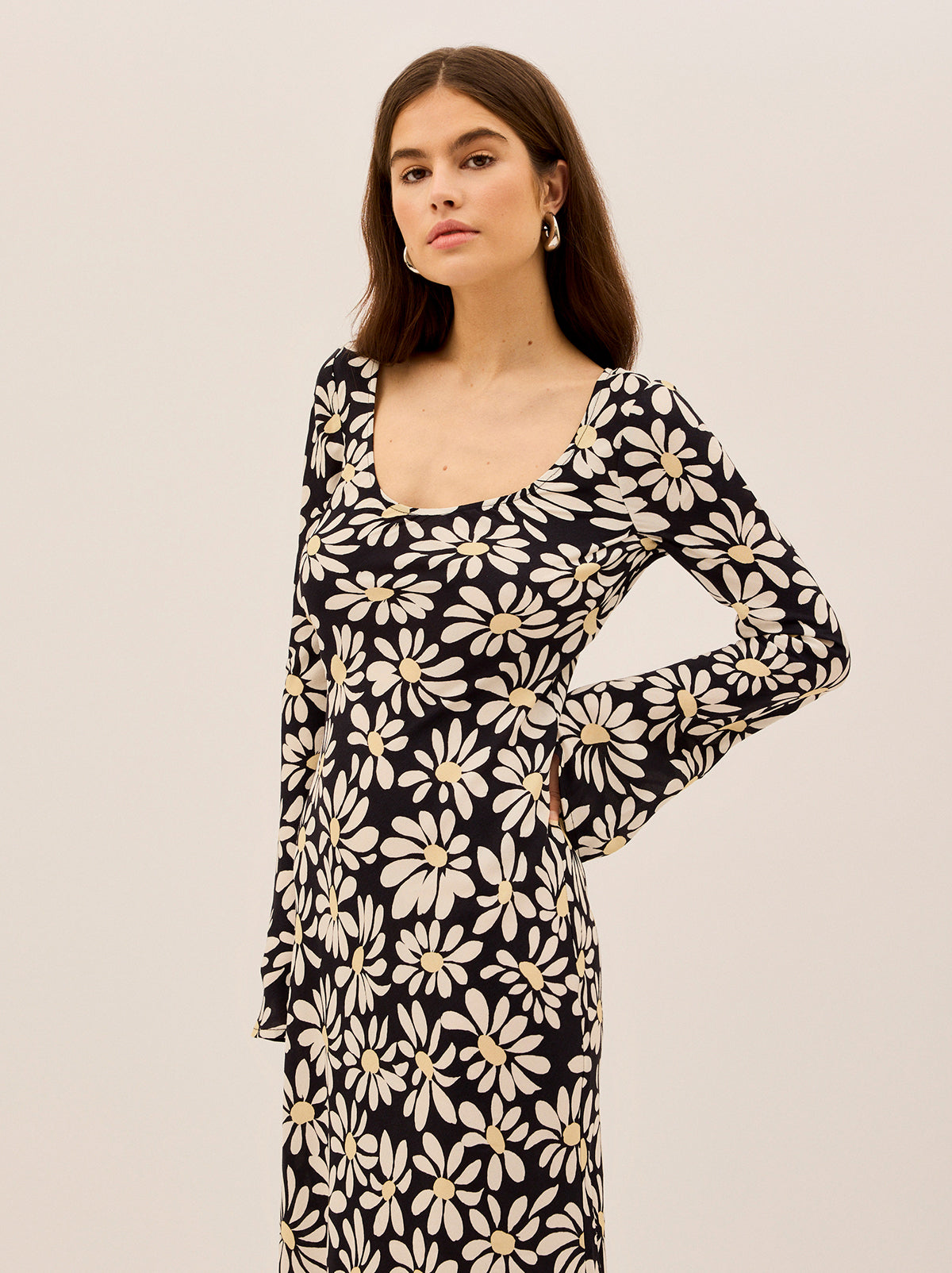 Meet Gia, your new go-to midi dress for effortless elegance. Crafted in a flattering bias cut, this dress skims the body in all the right places, creating a beautifully fluid silhouette. The deep scooped neckline adds a hint of modern allure. Designed in our charming new daisy print, Gia is a fresh, feminine staple that works for both daytime chic and evening glamour. Just add strappy heels and your favorite accessories for an instantly polished look.