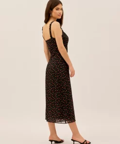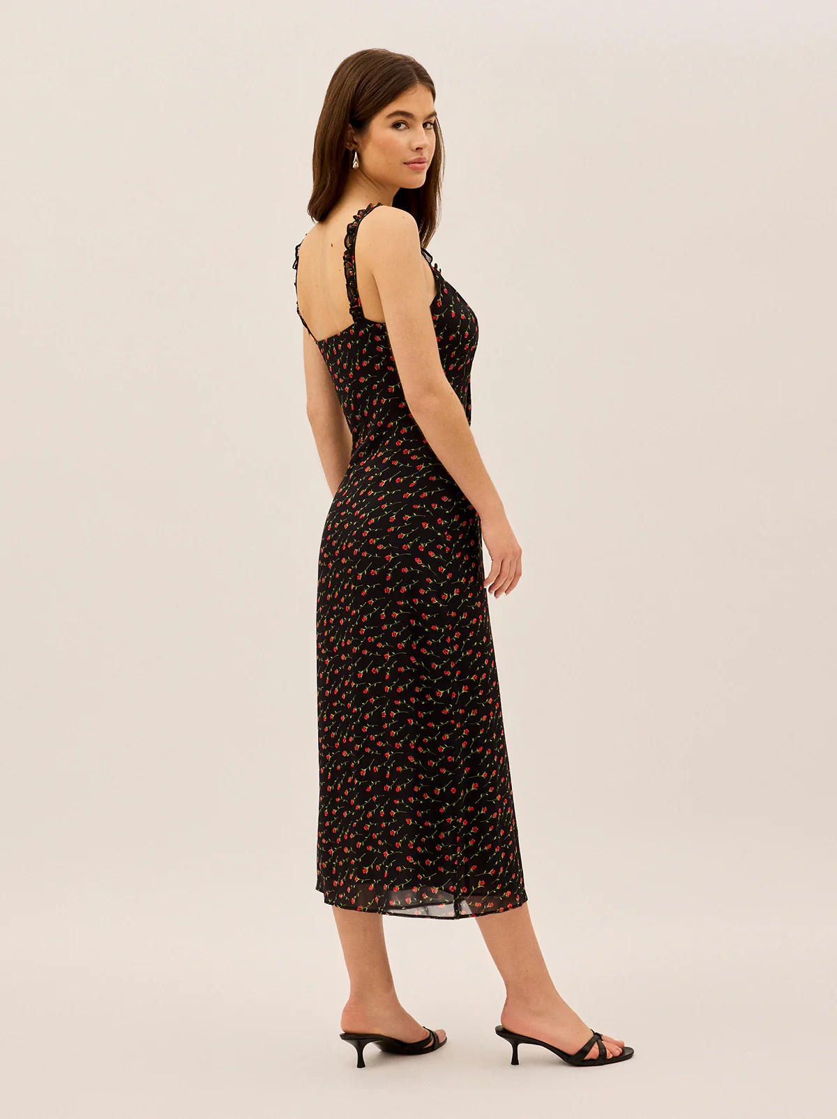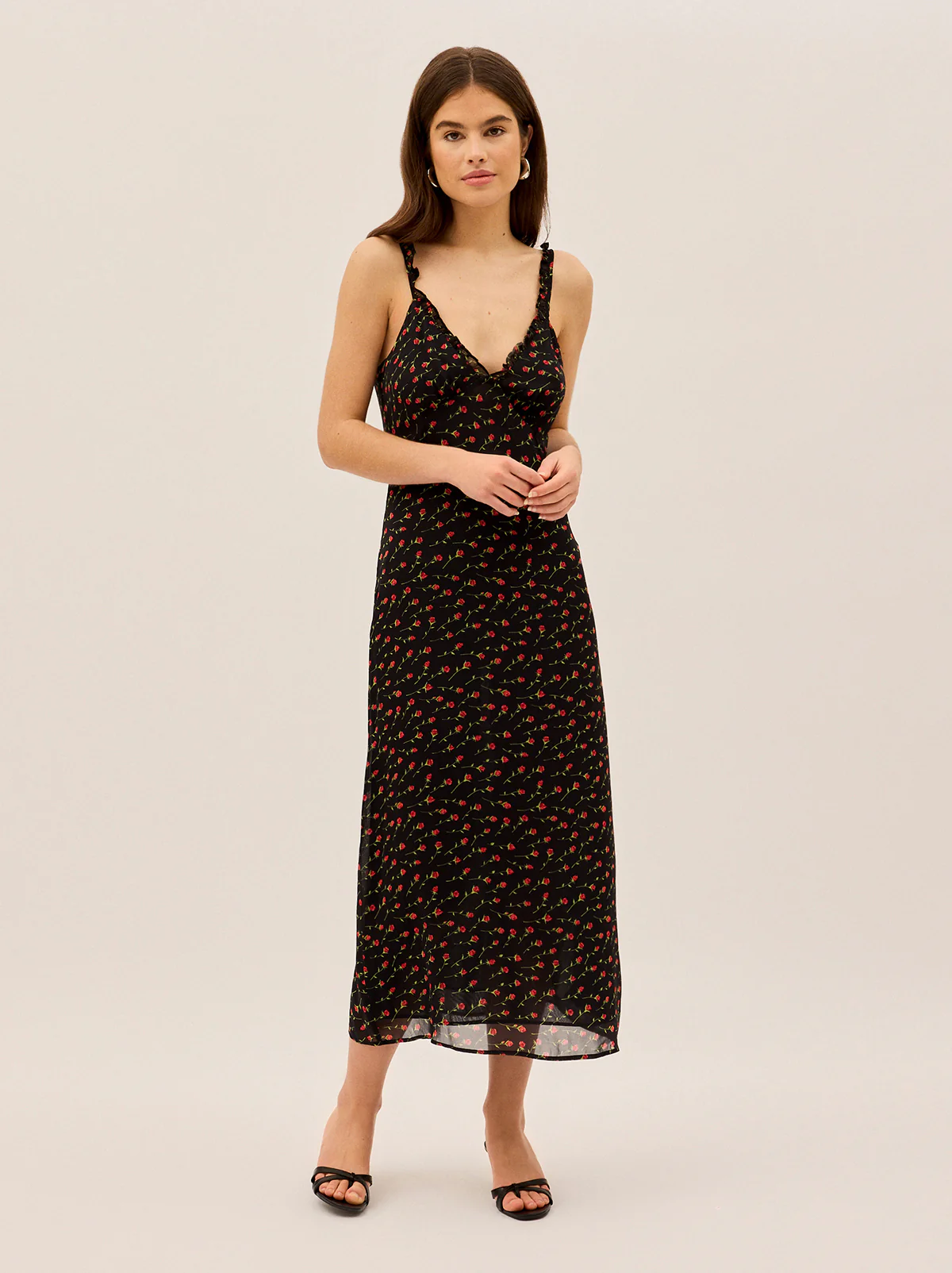 Meet Norah, your new favourite slip dress with a vintage-inspired twist. Designed in a delicate black rose print, this effortlessly feminine midi dress features micro frill details at the neckline and straps, adding a subtle, romantic touch. Crafted from lightweight viscose georgette and fully lined in soft black georgette, Norah drapes beautifully while ensuring all-day comfort. Whether styled with heels for an elegant evening look or layered with a knit for effortless daytime chic, this is the dress you’ll reach for again and again.