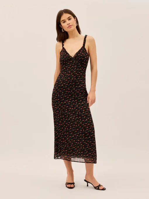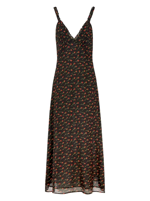 Meet Norah, your new favourite slip dress with a vintage-inspired twist. Designed in a delicate black rose print, this effortlessly feminine midi dress features micro frill details at the neckline and straps, adding a subtle, romantic touch. Crafted from lightweight viscose georgette and fully lined in soft black georgette, Norah drapes beautifully while ensuring all-day comfort. Whether styled with heels for an elegant evening look or layered with a knit for effortless daytime chic, this is the dress you’ll reach for again and again.