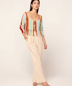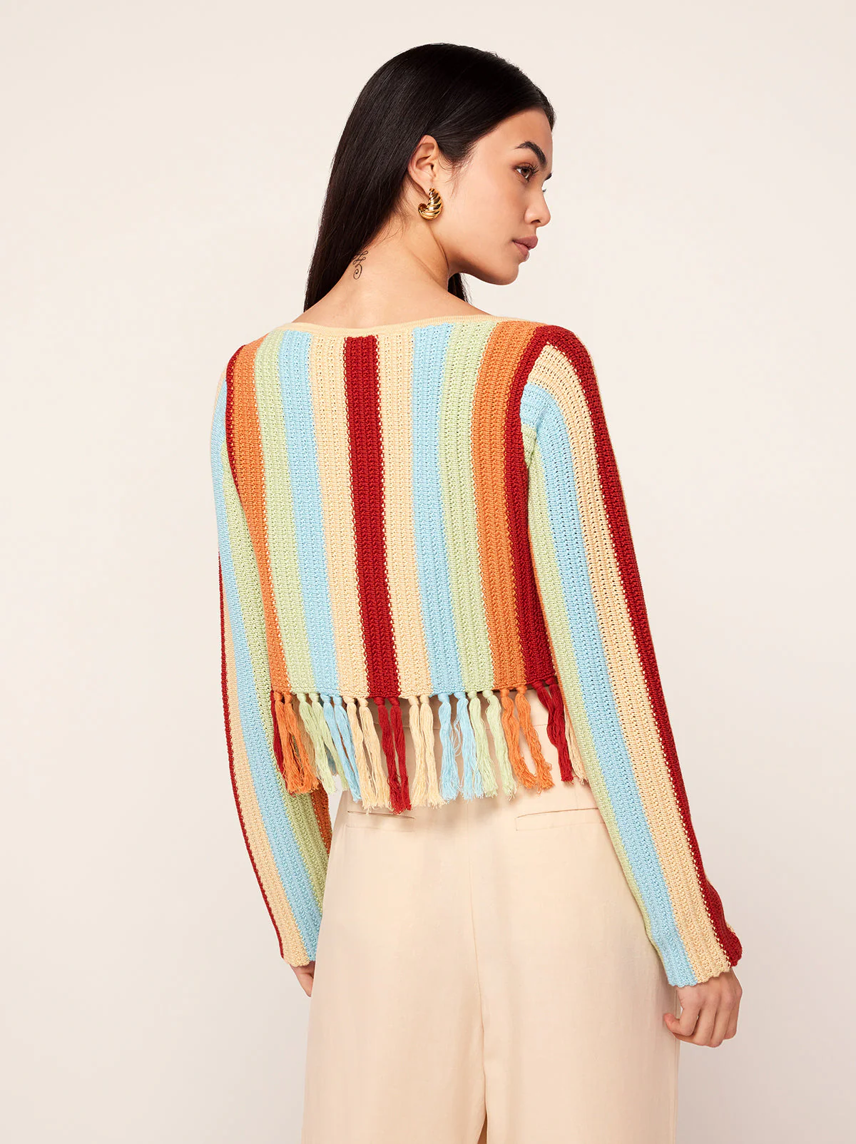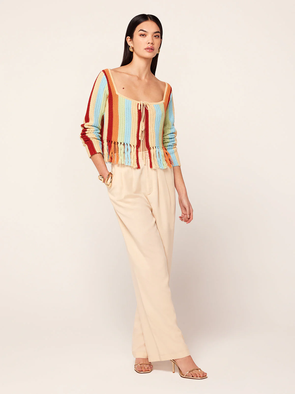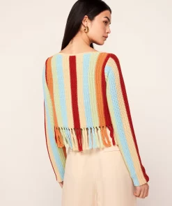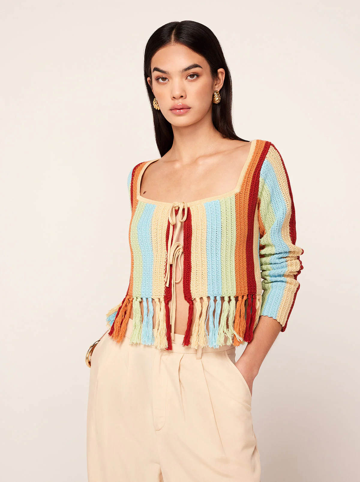 Not your average crochet cardigan. Taylor is a long sleeve multicolour woven stripe knit cardigan with a flattering square neckline and centre-front ties. Her hem fringing adds a little fancy. Wear over a t-shirt as a true cardigan or on its own as a top, because a little skin never hurt anyone.